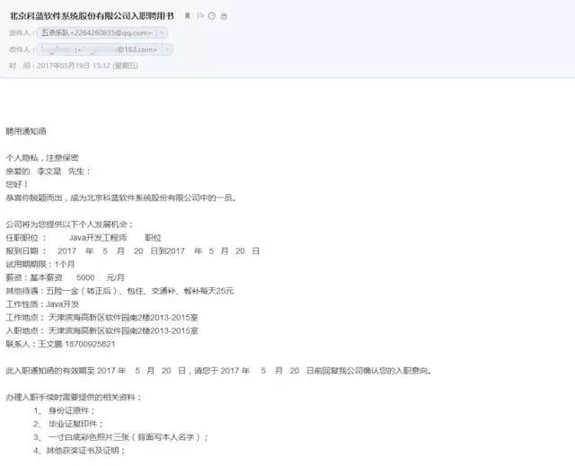 李文星事务中,其实有几个很较着的问题, 好比:仅一个德律风面试,仅几个简单的问题就通知入职,好比入职offer来自QQ邮箱,这一系列的非常流程,只需稍微留意,稍微有些平安常识就可能会避免。