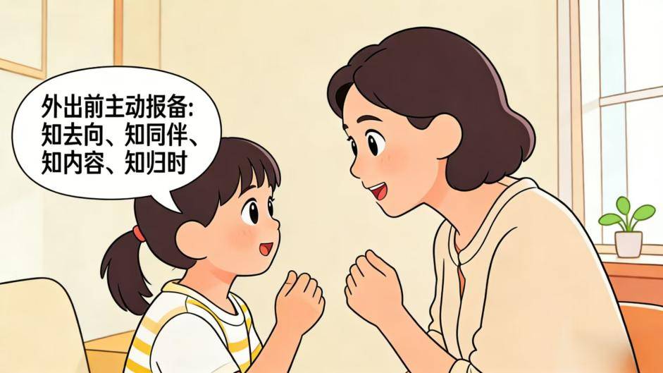家长要教育孩子零丁外出前,必需自动向家长细致报备,家长要做到知去向、知火伴、知内容、知归时。熟记家庭住址、家长姓名及电线 等急救德律风。